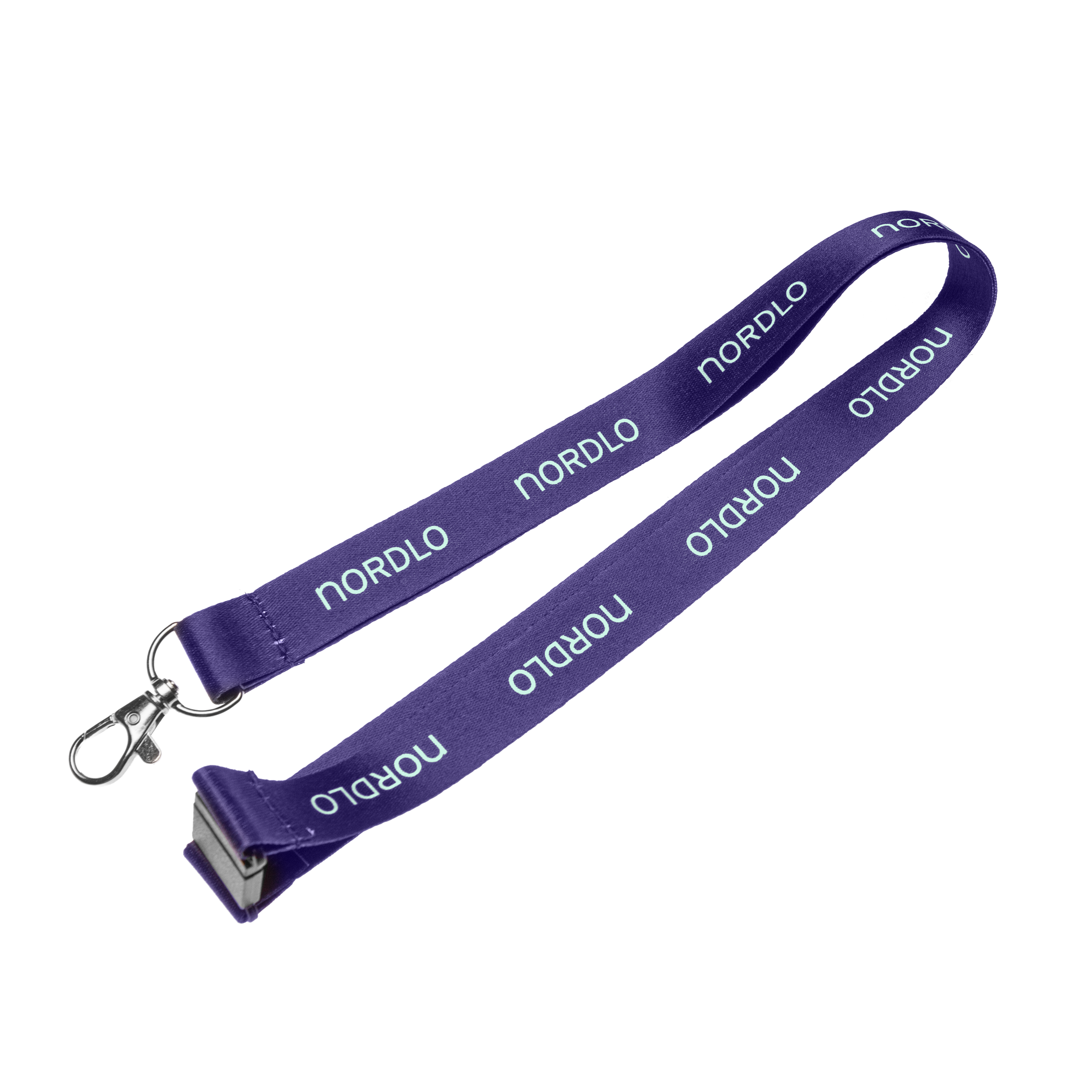 Nyckelband i polyester, 20mm med karbinhake och säkerhetsspänne i nacken.